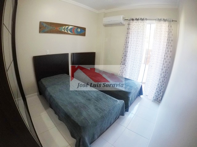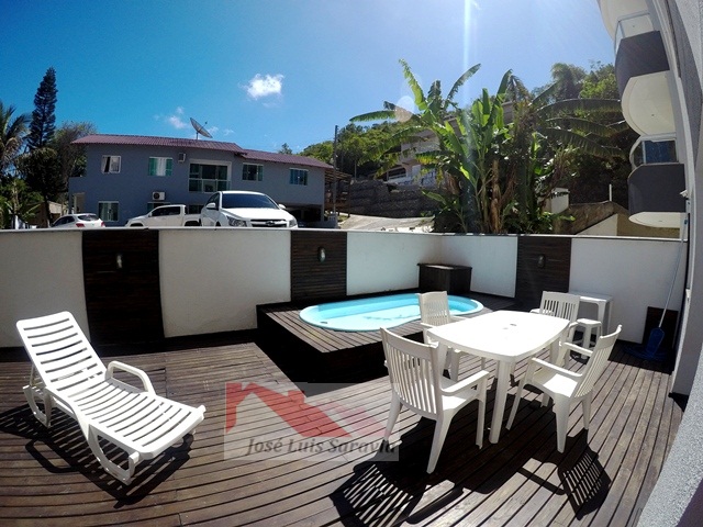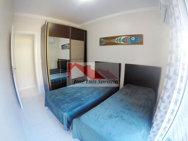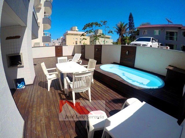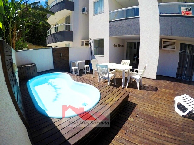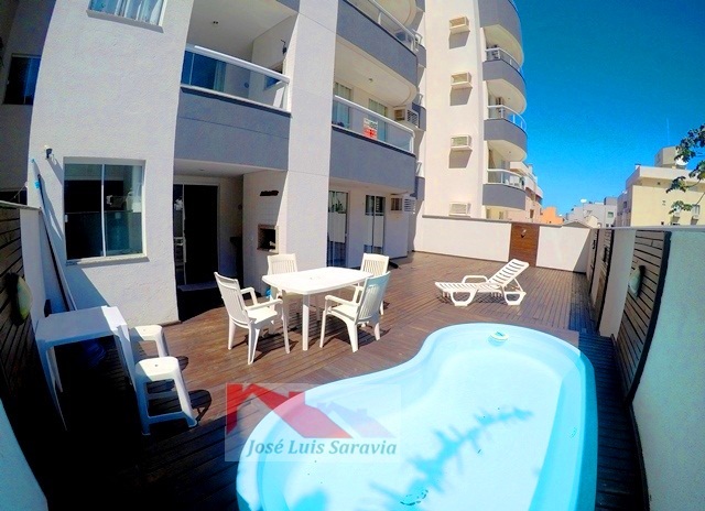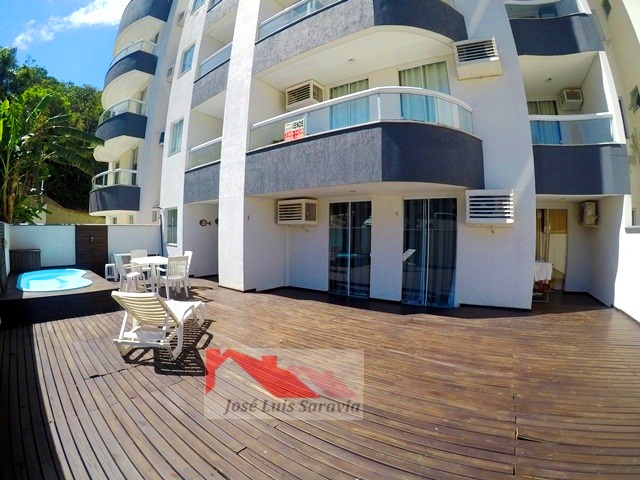 Apartamento terreo a 100 metros da praia de Bombas, 3 quartos de casal com ar condicionado e colchao extra, 2 banheiros, maquina de lavar, amplo deck com piscina e churrasqueira privativa, 1 vaga de garagem.